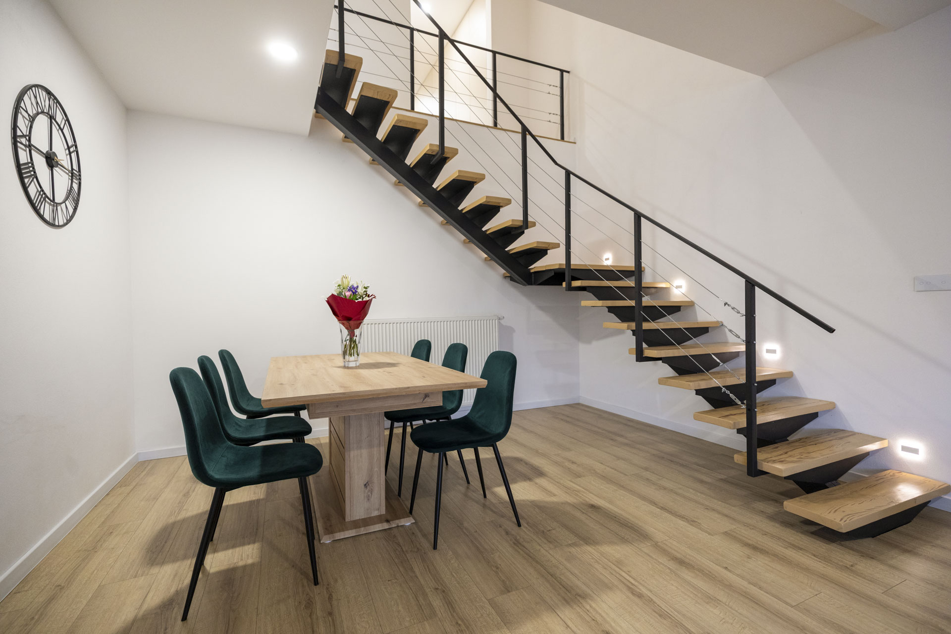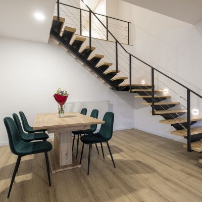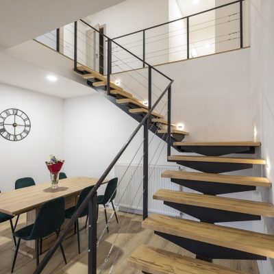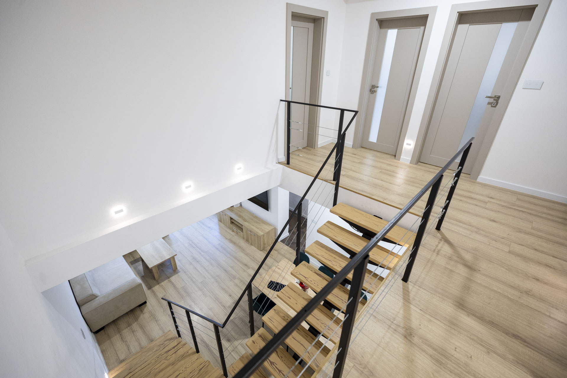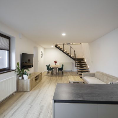 • Denná obytná časť (30m2) : Otvorený priestor obývacej izby s modernou kuchyňou a schodiskom.
