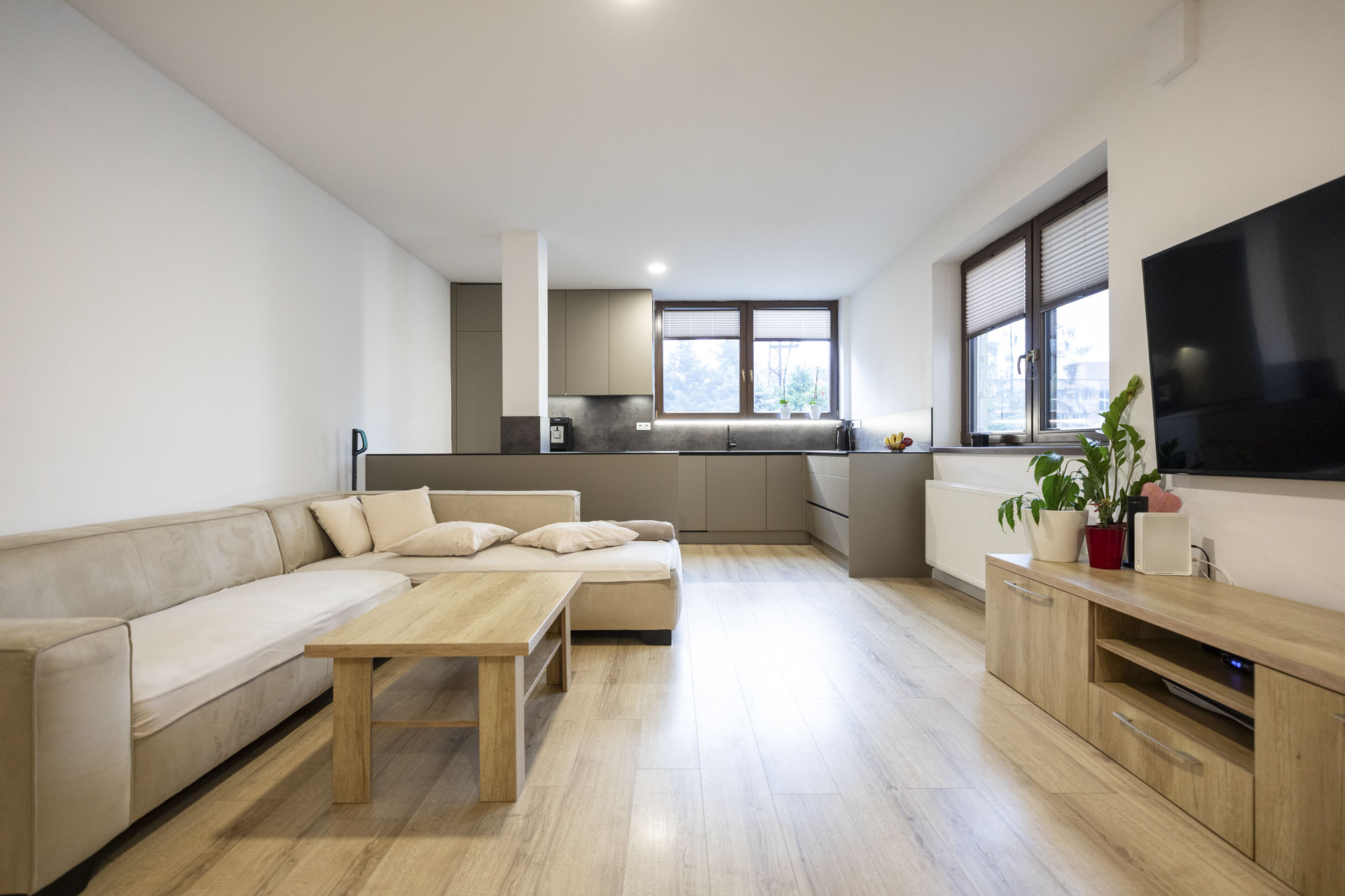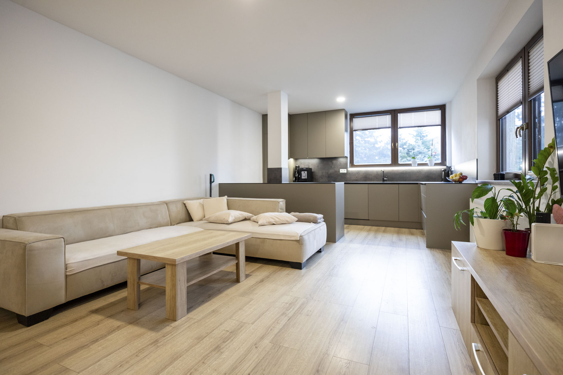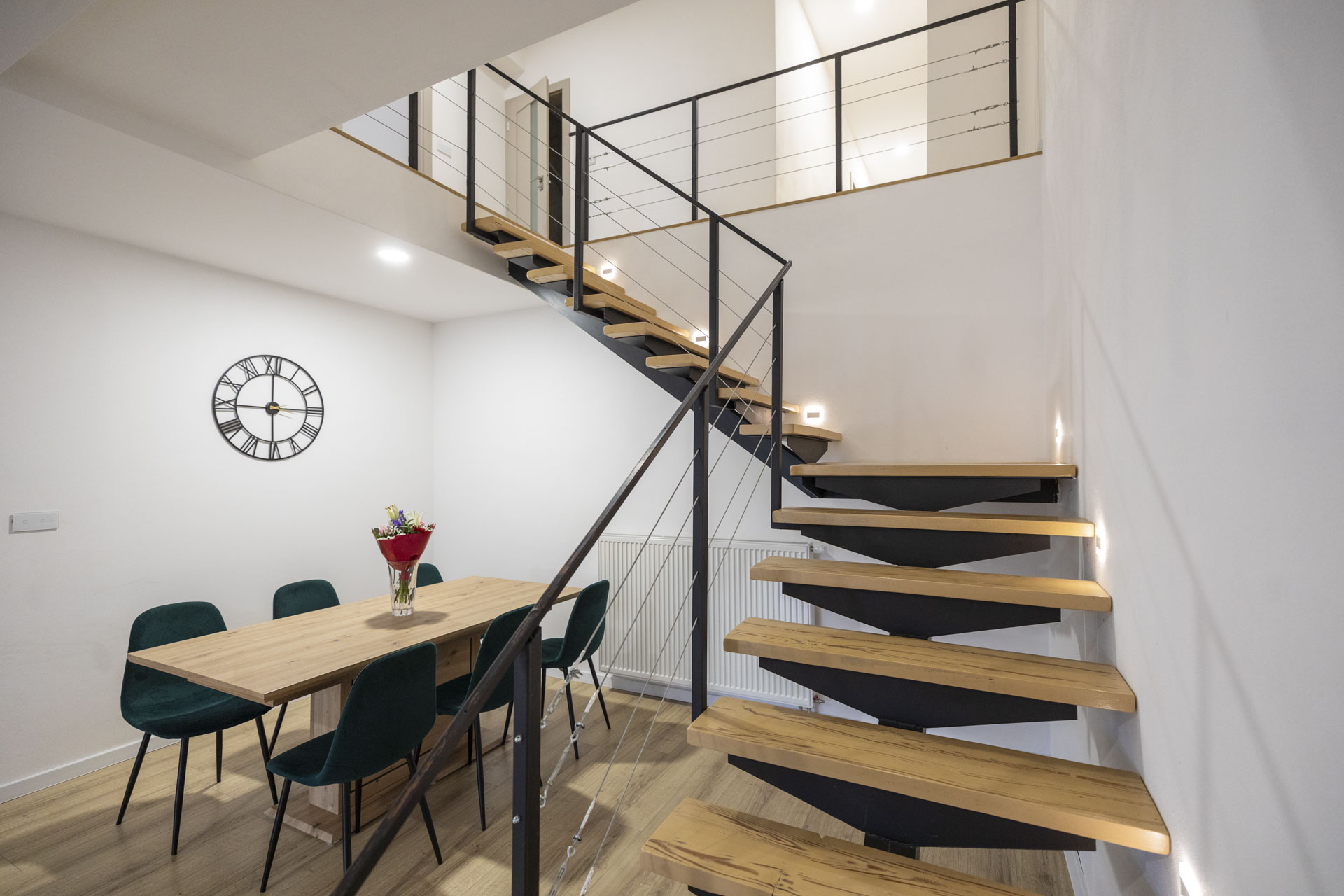 • Denná obytná časť (30m2) : Otvorený priestor obývacej izby s modernou kuchyňou a schodiskom.